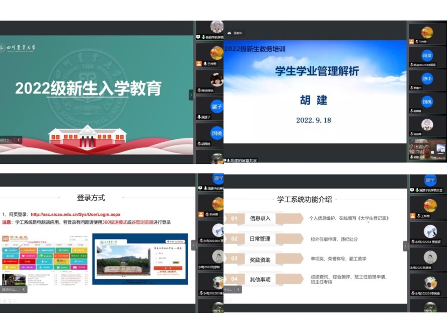 杨丽萍老师从学院概括、校园活动、学生手册等多方面为学生阐述了大学生活中应该遵循的校规校纪。学业管理解析与学工系统使用指南两个板块中,胡建老师与罗惠中老师通过PPT和系统操作结合的形式,向同学们详细介绍了如何使用教务管理系统与学工系统中的常见功能,在互动环节为同学们进行了答疑解惑。
