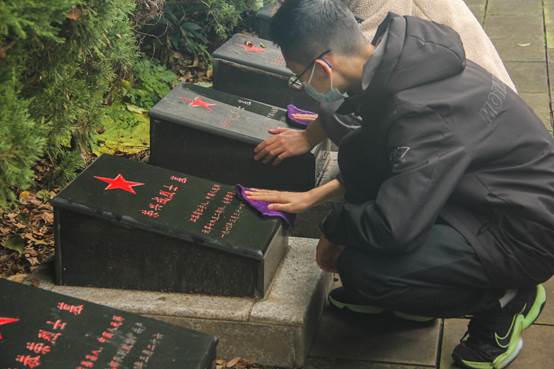 活动最后,青马班和团委实践部的同学拿上提前准备好的抹布和水桶,俯身烈士墓碑前,逐一擦拭烈士陵园内344块烈士墓碑。在同学们的努力下,烈士的名讳事迹恢复原先赤红的色泽,在擦拭的过程中也重新认识了在此沉眠的烈士们,他们大多于青春少年之时便在战役中失去生命,为祖国的解放献出了自己的全部。