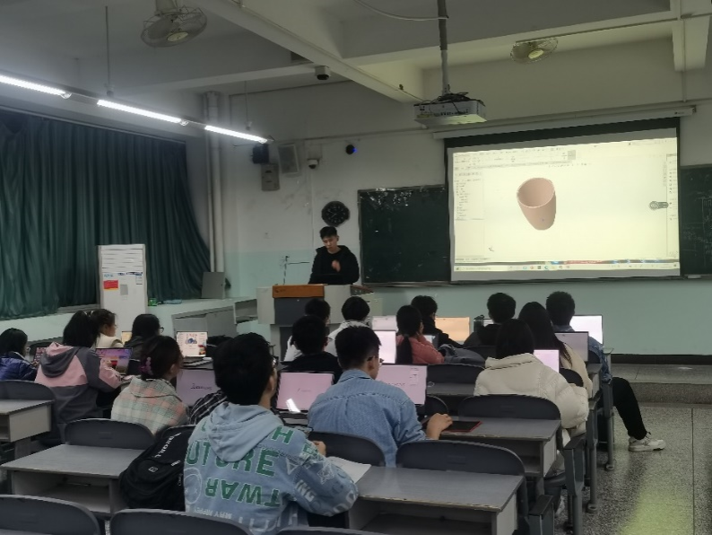 培训会上,陈波讲解了该软件的应用性及如何系统学习三维建模软件,并分享了个人的学习心得及方法,以绘制基础模型为例带领社内成员进行学习,耐心讲解创建模型的基本步骤并逐步演示,成员们紧跟培训主讲人的步伐,但由于对建模软件初次接触,部分同学存在中间卡壳、跟不上的情况。为了照顾到每一位成员的学习进度,主干成员们为操作上遇到困难的同学逐个解答,成员之间也积极反馈问题并互相帮助,整体培训氛围良好。随后,王涛结合自己的参赛和获奖经历,从选题方案、注意事项和优秀作品讲解等方面向大家分享了节能减排大赛的相关经验。在接下来的提问环节中,成员们纷纷向师兄请教比赛方面的知识,并积极表达自己的想法,激发了新成员们对专业技能大赛的创新性思维。