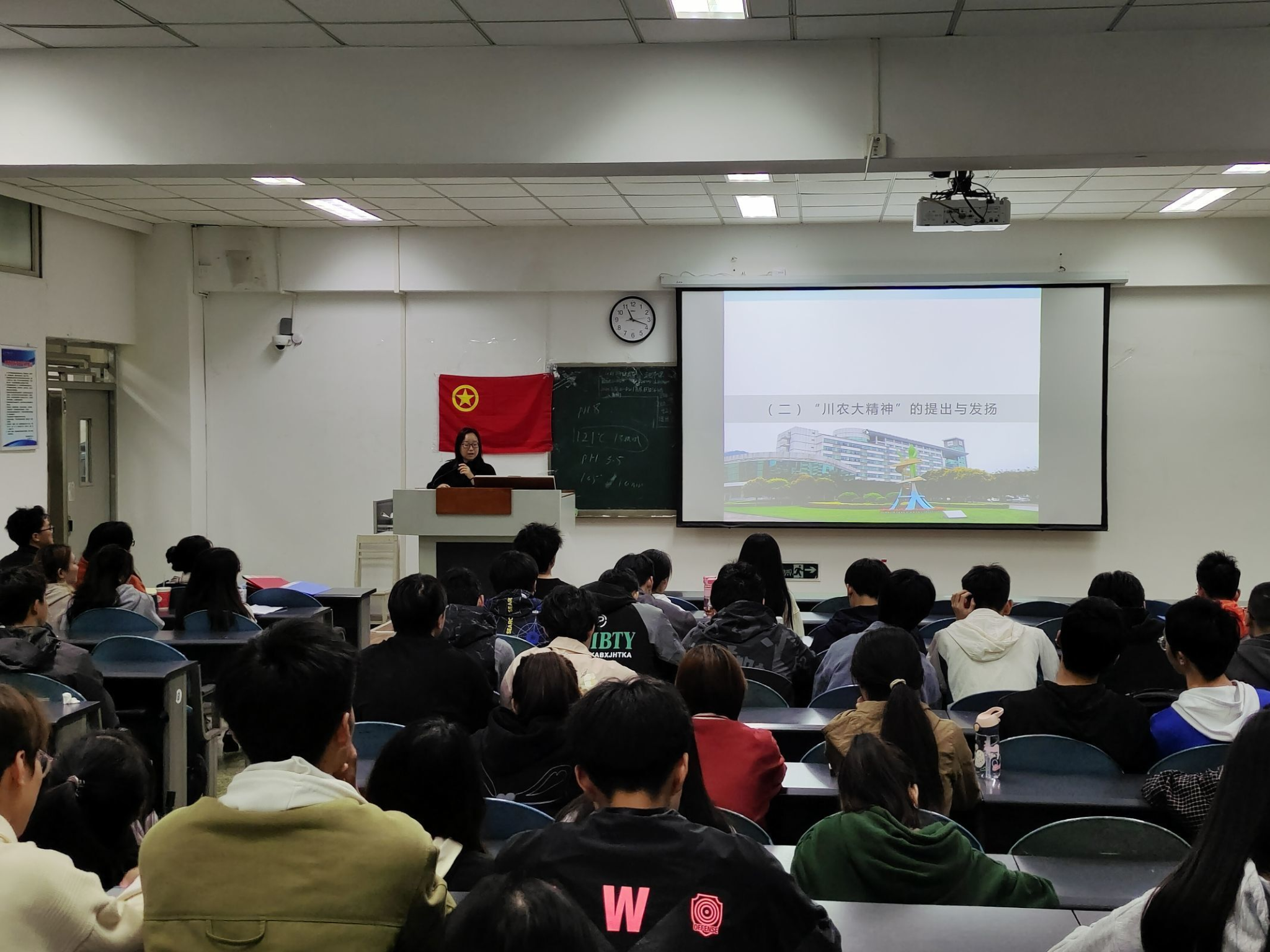 习近平总书记在党的二十大报告中对广大青年“立志做有理想、敢担当、能吃苦、肯奋斗的新时代好青年”的寄语,蕴藏着新时代青年奋斗的内驱力。在“九万里风鹏正起”环节中我们回顾了新时代习近平总书记与五四青年的十年,让同学们明白“做青年朋友的知心人、青年工作的热心人、青年群众的引路人”绝不是一句空话。理想信念是人精神上的“钙”,没有理想信念,人的精神就会“缺钙”。学生党员同志为同学们深入浅出的开展了习近平新时代中国特色社会主义思想主题教育领学,为青年学生补充精神之钙。随后两位团员代表分享了《习近平青春岁月》、《故事里的中国》观后感。团委副书记杨丽萍为团员青年们言传身教,从川农大精神出发,详细讲解作为川农学子该如何践行五四精神,发扬川农大精神,助力民族复兴。