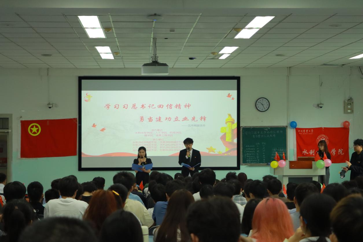 为纪念“五四运动”104周年,学习习近平总书记回信精神,引导青年对建设农业强国进行深入思考,激励同学们更好传承五四精神并在当下时代中展望未来。5月26日上午,由水电202203、水电202204、水电202205、水利202201、农机202201、人力202203、物联网202201、信科202204八个团支部联合开展的团日活动在10-A303顺利举行。本次活动以“学习习近平总书记回信精神,勇当建功立业先锋”为主题,同时邀请到校第九期青马班学员罗雅琳师姐、徐丹萌师姐,五四红旗团支部能动202004副书记杨永健师兄,以及学校职业生涯规划与就业指导课程教研室黄青老师担任嘉宾,8个团支部共计245人参加。