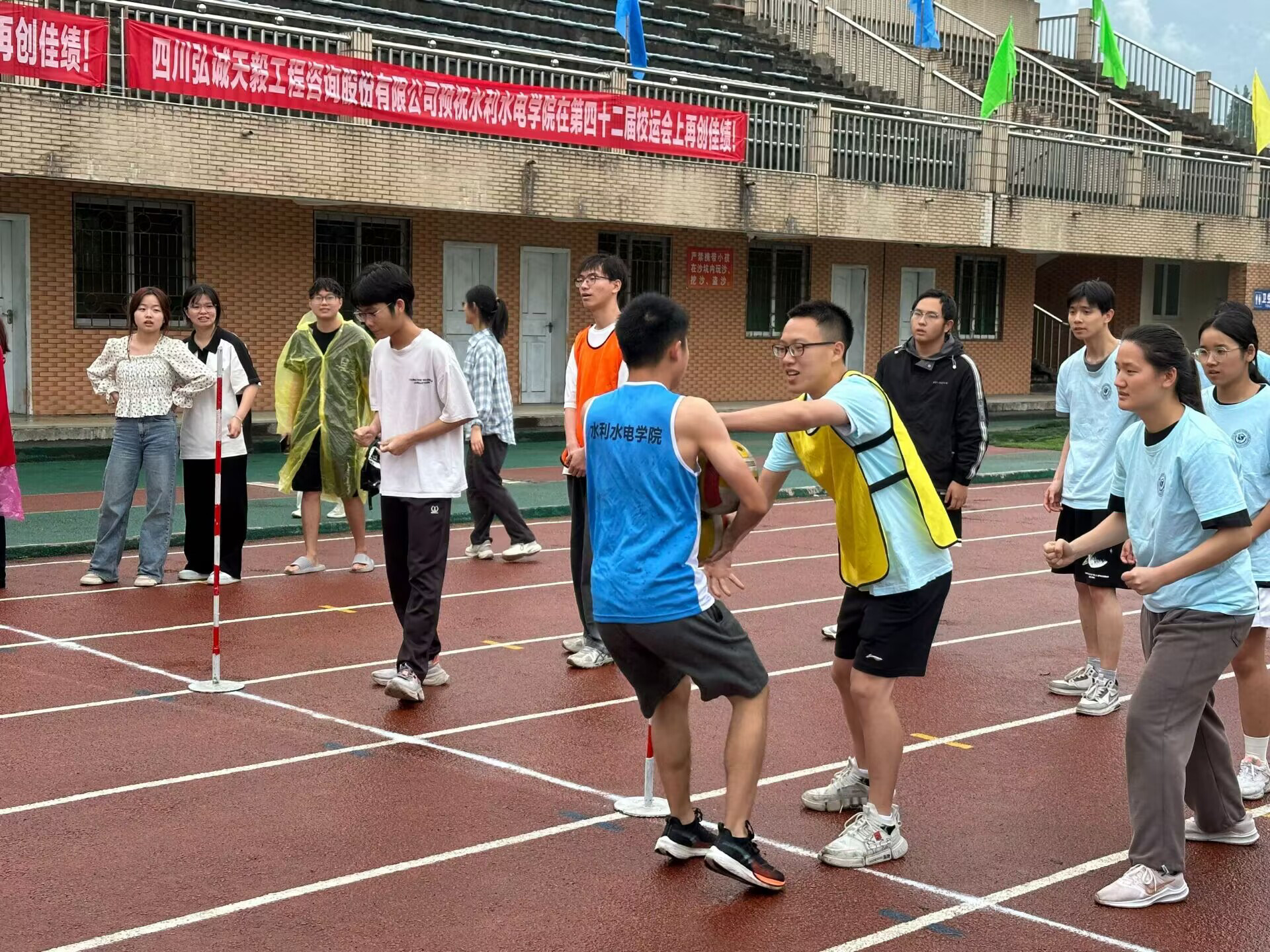 学院运动健儿们无惧细雨淋漓,精神抖擞、斗志昂扬,洋溢着青春的激情,迈开矫健的步伐,在跑道上挥洒着他们的汗水。比赛过程中,运动员们努力拼搏、不断进取、超越自我,心怀满腔热血,怀抱着排球在雨中奋勇奔跑。