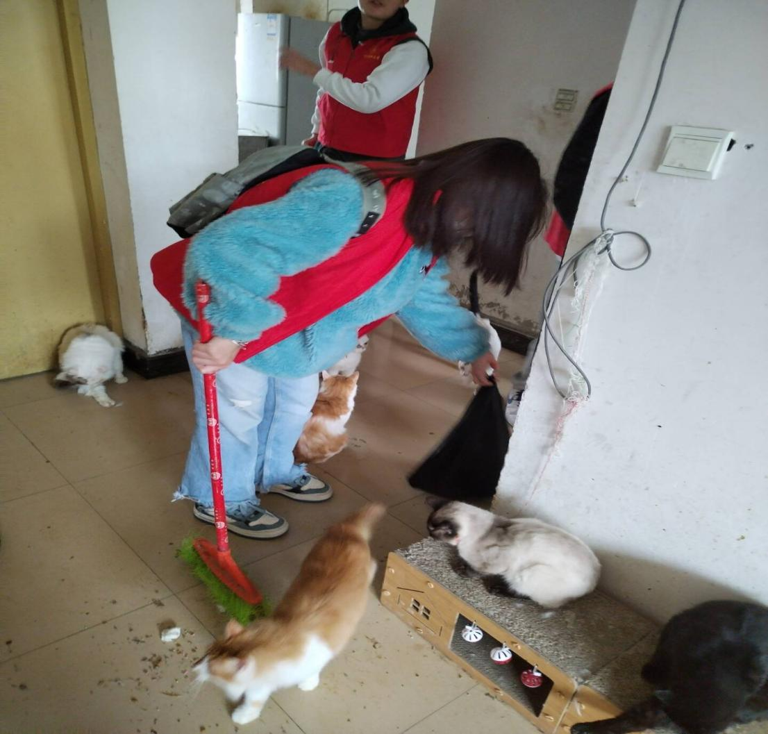 但志愿者们并没有因为环境的脏乱而抱怨,开始了认真有序的清理。将地面上的食物残渣打扫干净并用塑料袋把小猫的排泄物装走,使流浪猫的生活环境得到改善。志愿者尼玛拉姆感慨道:“流浪猫都很亲人,在我们打扫时会不怕生地贴近,我看到经过清理后整洁的房间也由衷地感到高兴。但一些小猫的身体情况不太好,还需要更多的帮助。这次活动也让我感受到了工作人员的不易,我们也应为保护流浪猫努力。”