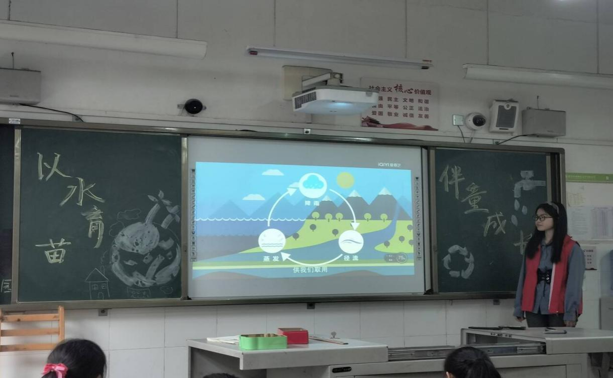 18日上午,志愿者们早早地到达了太平实验小学,进入班级后,便利用课间时间对教室展开布置,将水与植物的故事描绘在黑板上,让小朋友们提前了解本节课的大概内容。