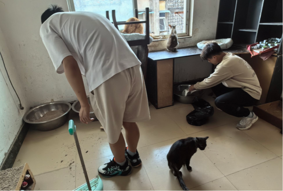 短暂地熟悉环境后,志愿者们便分工进行基地的卫生打扫,铲猫砂、扫地、拖地被有序地完成,午后地阳光透过窗户,为忙得热火朝天的志愿者增添了一剂猛料。“我已经满头大汗了,味道也有些刺鼻,但看到原本脏乱的环境被我们整理干净,还是感到很欣慰,我们还为猫咪们换上新的猫砂和纯净水,猫咪们在旁边温驯地观望着,很和谐。”志愿者杨晗羽回顾道。