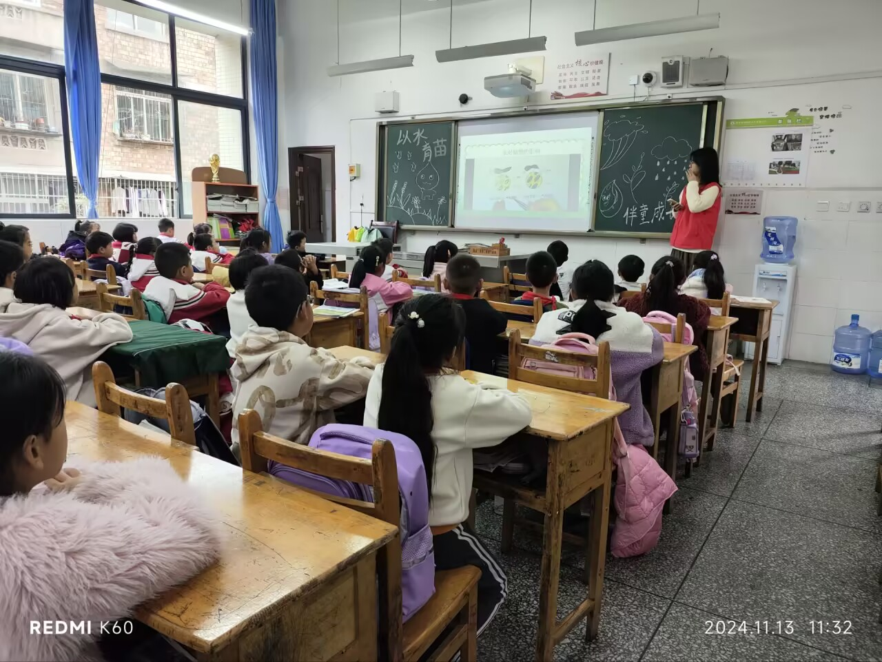 志愿者一行进入书声朗朗的校园,操场上正在上体育课的小朋友欢快奔跑前来迎接,随后志愿者到达活动班级,开始黑板报和物品布置和准备,“小朋友们很可爱、懂事,在我们布置时主动询问是否需要帮忙。”志愿者陈可杰回忆道。随着上课铃声响起,志愿活动正式开始,主讲人刘佳怡从水对植物的作用向小朋友进行讲述,小朋友紧紧跟随着主讲人的脚步进入“水与植物”的世界,探索水对植物的作用、认识植物的分类、思考身边植物的分类。主讲人刘佳怡表示:“小朋友观看视频都很认真,回答问题都非常积极,而且也非常准确”。
