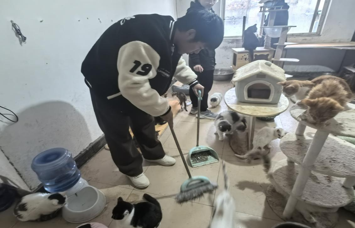 下午 14:00,志愿者们抵达流浪猫基地。一进门,浓烈的猫咪排泄物味道扑面而来,但志愿者们并未退缩,迅速投入到清洁工作中。他们铲猫砂、拖地、喂食,各项工作井然有序,用双手为猫咪们打造出更加干净、舒适的生活环境。
