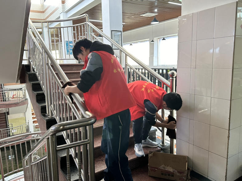 活动现场,志愿者同学们科学分工,明确任务后便投入到紧张有序的打扫工作中。一个分队负责擦拭桌椅,他们仔细清除桌面污渍,对桌椅腿和缝隙也认真擦拭,让原本斑驳的桌椅焕然一新。另一分队则专注于清扫地面,用扫帚耐心清扫每一寸地面,将食物残渣、灰尘等垃圾聚拢后用簸箕清理干净,随后又用拖把反复拖洗,直至食堂地面光亮如镜。食堂作为广大师生每天就餐的场所,卫生状况直接关系到大家的身体健康。一个干净整洁的食堂环境,既能让师生们拥有愉悦的就餐心情,又能有效预防疾病传播。通过此次亲身参与打扫食堂的活动,志愿者们深刻体会到每一个干净的餐盘、每一张整洁的餐桌、每一寸光亮的地面背后,都凝聚着无数工作人员的辛勤付出。