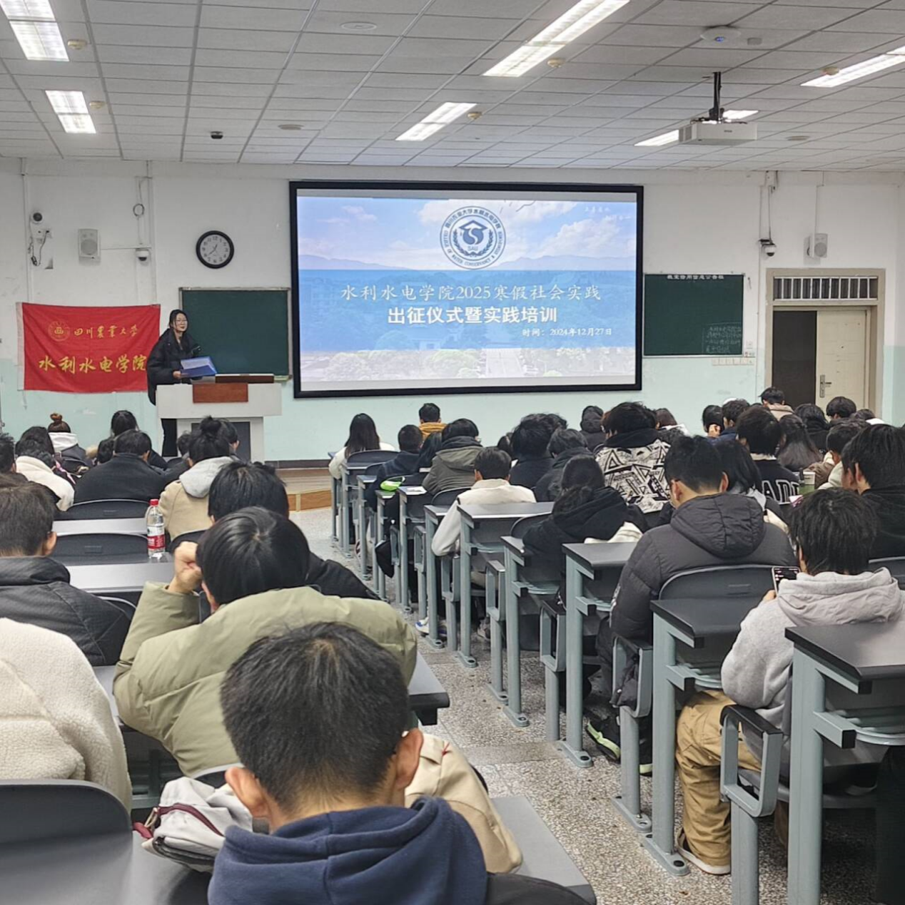 为推进2025年寒假社会实践有序开展,12月27日,学院团委实践部于10-A101举行了学院寒假社会实践出征仪式暨新闻、摄影技能专题培训会,党委办公室副主任、团委副书记杨丽萍老师、党委办公室罗磊老师、全院拟参加团队骨干、小班班干部一百余人现场观摩学习,会议由邢子彤同学主持。