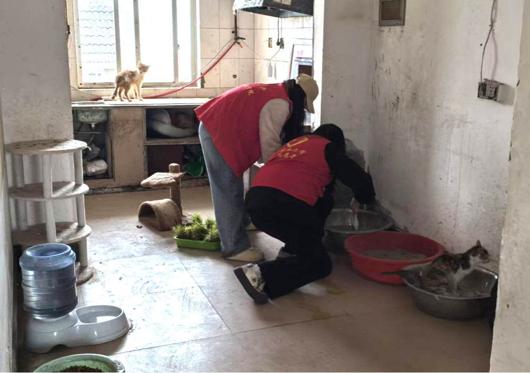 经过2小时的辛勤劳动,流浪猫基地的环境焕然一新。十余个猫砂盆完成深度清洁,猫咪活动区域的粪便与污渍也被彻底清除。志愿者们的努力不仅改善了流浪猫的生活环境,也让他们脸上洋溢着救助生命的自豪与满足。