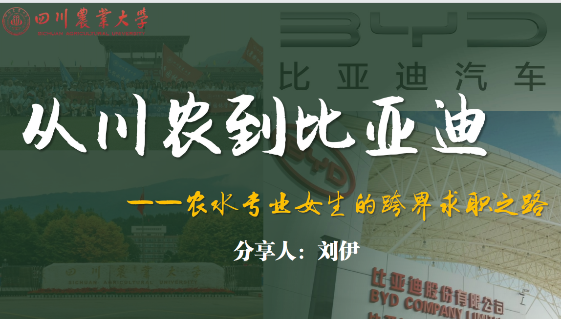 刘伊以《从川农到比亚迪》为主题,分别从“认知破界”“简历炼金”“跨界突围”三个方面,以幽默风趣的语言结合自身经历进行详细讲解。