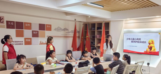 午后,阳光转烈,课堂更“红”。团队把爱国教育搬进社区,从党的发展到党的指导思想;从党的旗帜到党的故事,孩子们听得聚精会神。而党的故事分享也将今天的活动推到高潮。平时浮躁的孩子们在观看《金色的鱼钩》时异常专注认真,眼里满是崇拜与感动。团队成员秦怡同学深有感触地说“看着大家在学习爱国教育课程时如此认真,我真的很欣慰,觉得祖国一定会有着一批又一批的优秀的新鲜血液。”