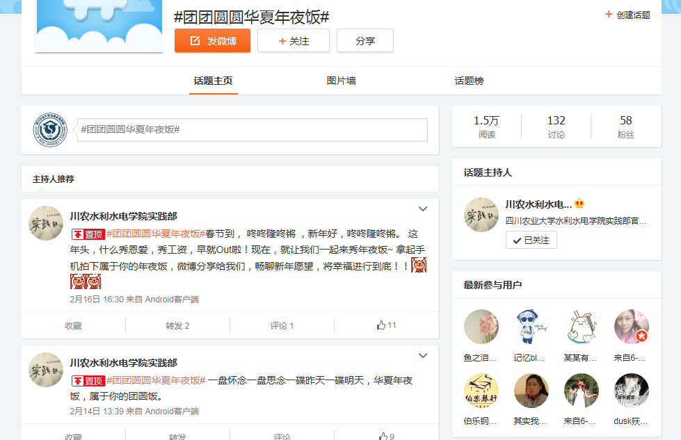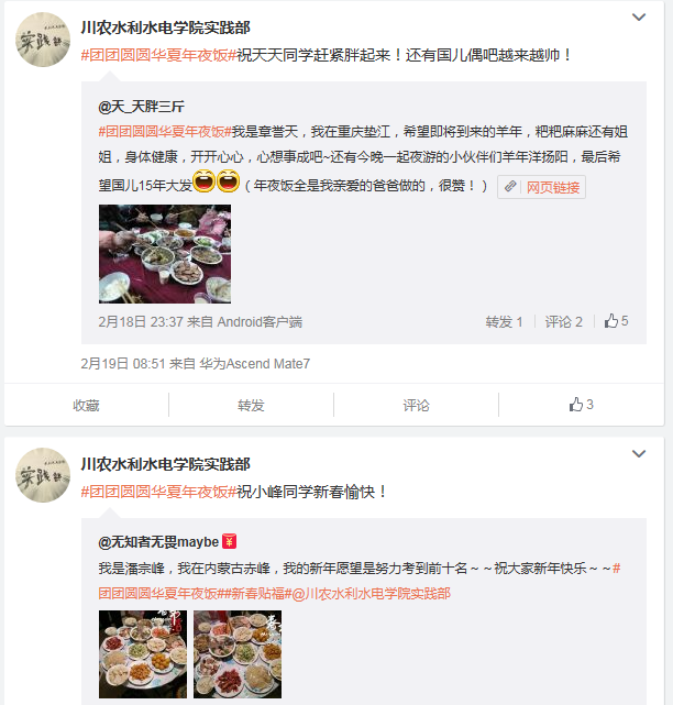 春节前夕,我校水利水电学院团总支实践部创建了微博话题“团团圆圆华夏年夜饭”。截至2月22日已有1.5万的阅读量,上百人秀出自己的年夜饭和新年愿望,一桌桌丰盛的年夜饭,一幅幅团圆景象,让人倍感喜气温馨,展现了我们的生活中传统文化风貌。