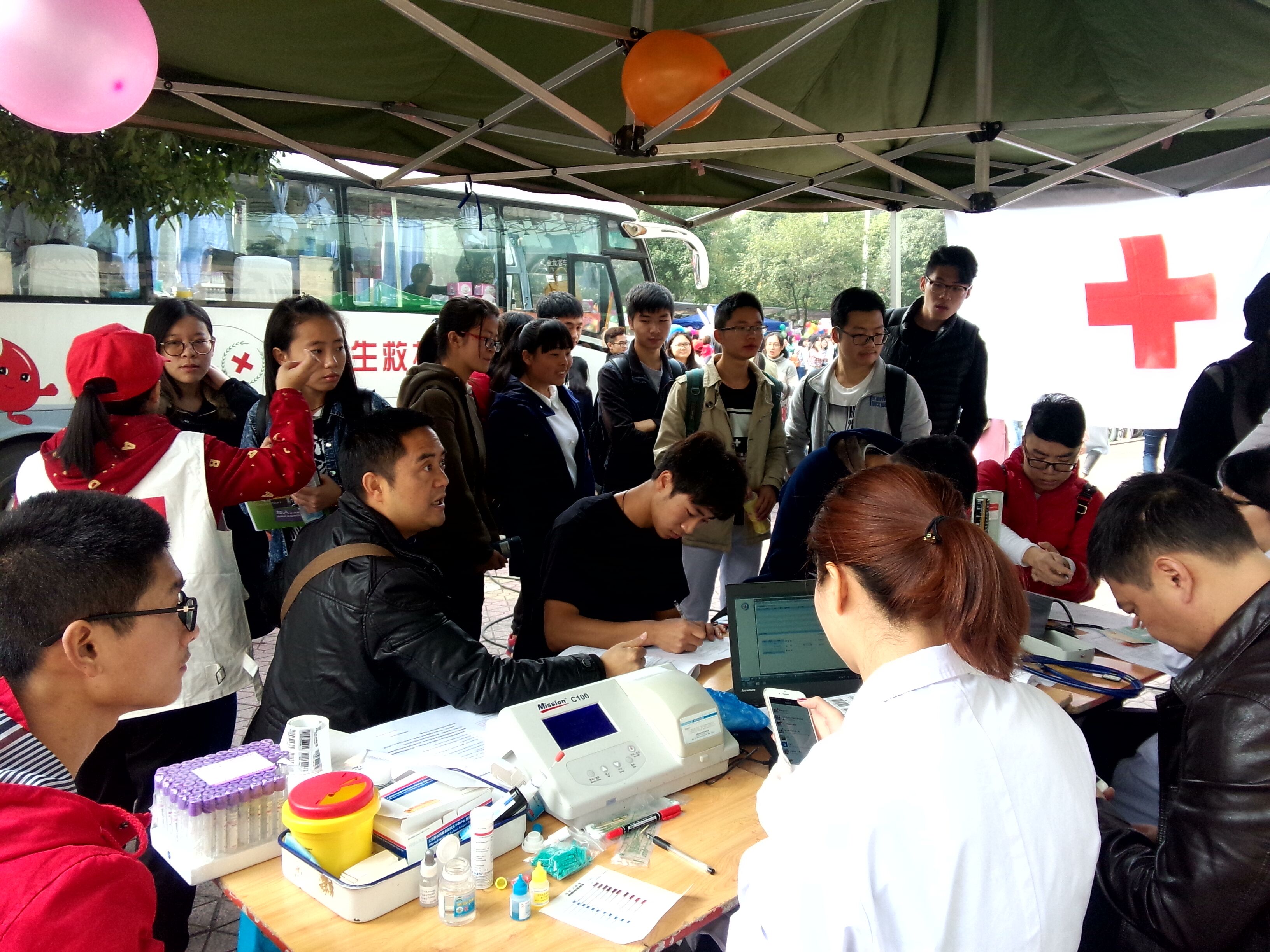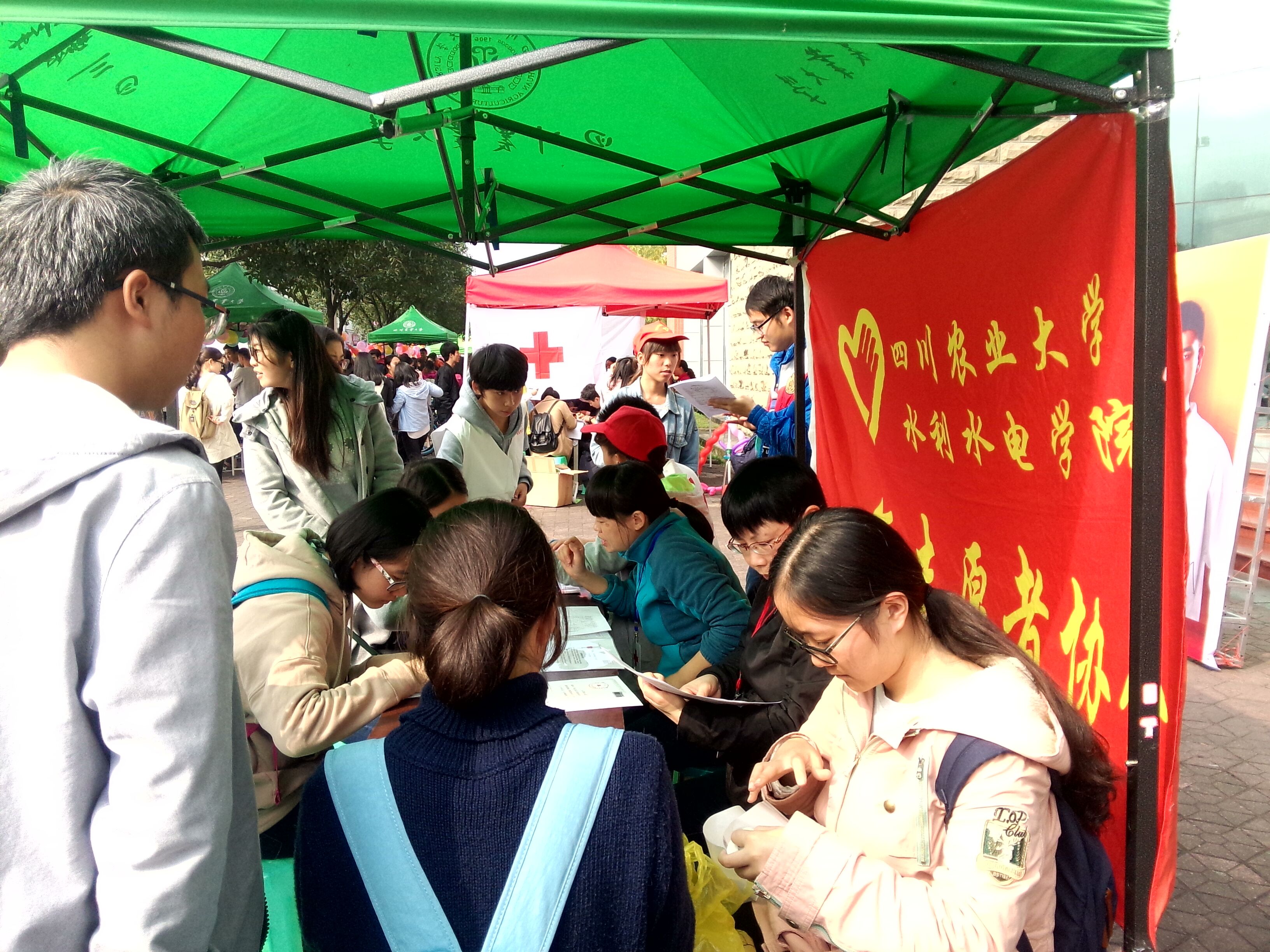 11月18日,四川农业大学水利水电学院志愿者工作部联合雅安市红十字会、雅安中心血站以及爱心站,于雅安校区杏苑餐厅前开展造血干细胞捐献者血样采集以及现场无偿献血活动。
