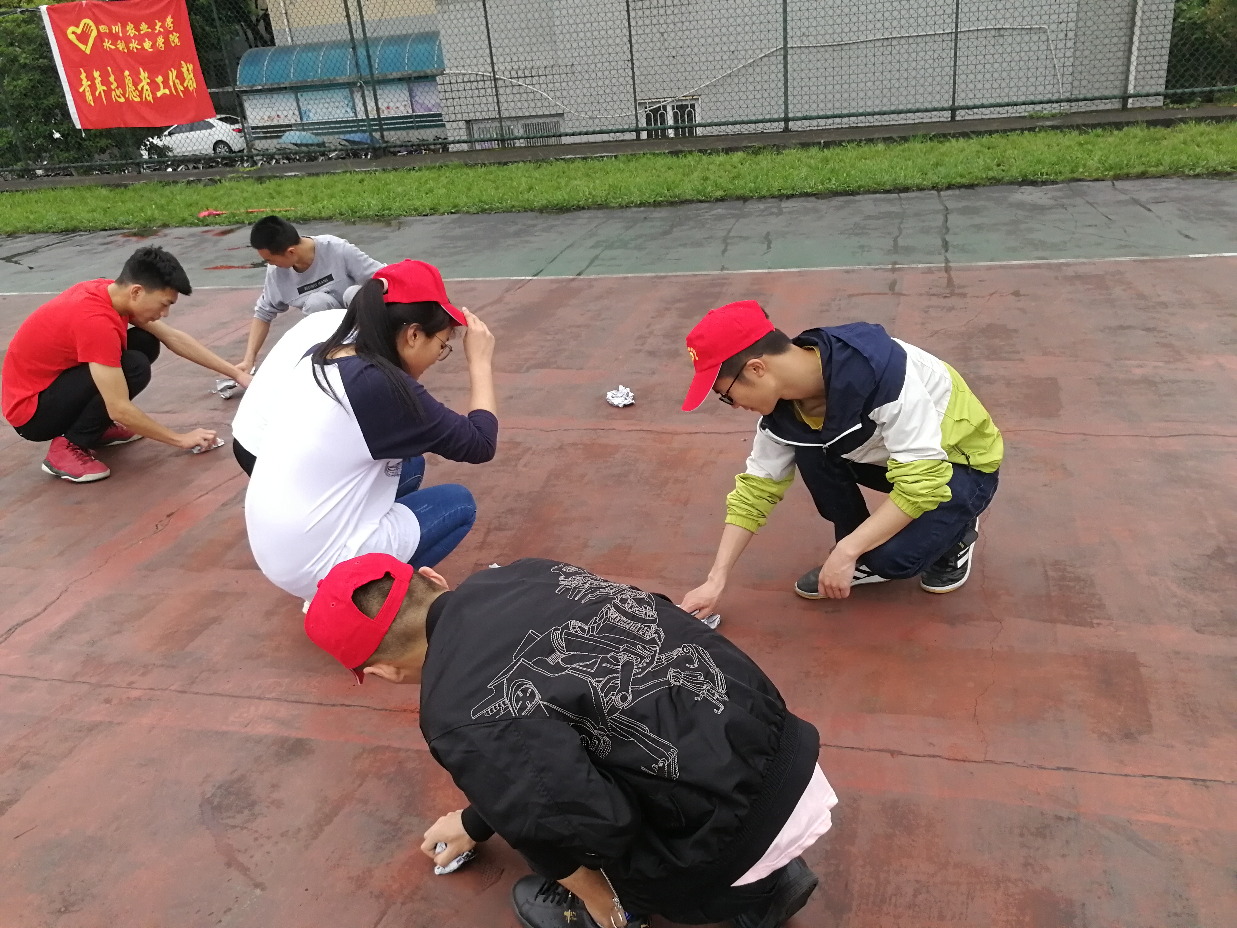虽然天气阴沉沉的,但这阻挡不了川农学子对运动会的热情。在上午拔河总决赛前,为确保比赛的顺利进行,志愿者们对场地进行了清理。拖地、擦地,志愿者们分工明确,志愿活动有条不紊的进行着,在拔河比赛前,将场地清理干净了。在上午紧张激烈的比赛结束后,人们陆续离场,那些"看不见"的垃圾逐渐开始显露出来。志愿者们有的两人一组搜寻,有的单独搜寻,跑这跑那,连一丝细小的垃圾都不放过,细心地将操场上以及跑道上的果皮纸屑、烟头、食品袋等收入袋中或者拿在手中。很快,整个运动场都变回了原先干净整洁的样子。在此次活动中,志愿者们收益良多。参加活动的志愿者古鸿宇说:“我为能够美化校园环境卫生,贴心服务师生而感到骄傲。”志愿者们在离开操场时,回身望见整洁的运动场,露出了开心的笑容。