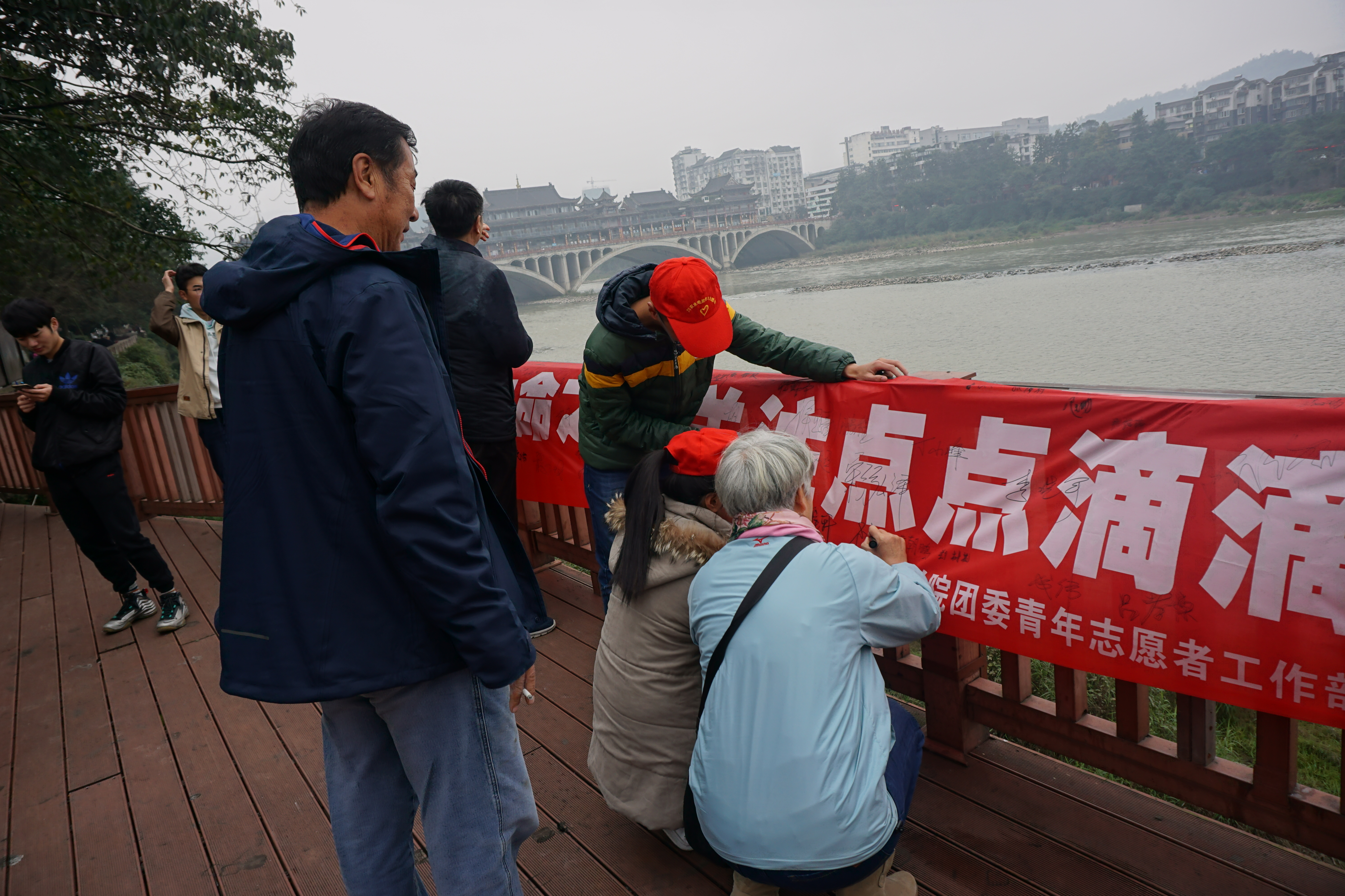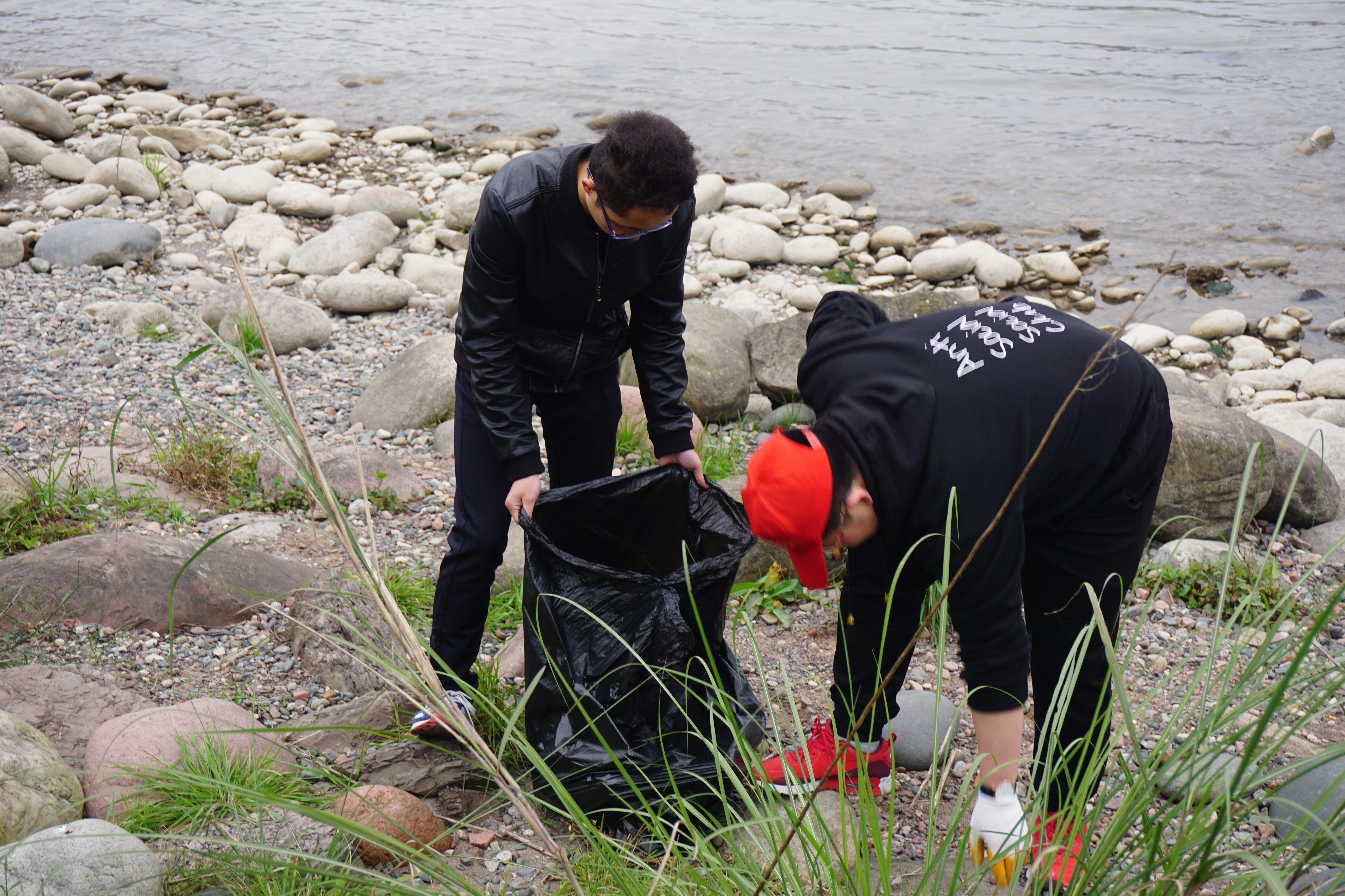 河岸边布满鹅卵石,不仅崎岖难行而且十分危险,负责清理河岸垃圾的志愿者们两人一组,一人用一些简易的工具捡拾大量丢弃在河岸边的烟头、饮料瓶、塑料袋等废弃物,另一人则用垃圾袋回收垃圾。与此同时,负责设点宣传的志愿者们在路边拉起横幅,大家戴着小红帽向过路的行人宣传保护母亲河,保护水环境的相关知识,并邀请他们到横幅上签下自己的名字。志愿者们坚持用自己的真诚去打动来来往往的行人,让他们也加入到保护母亲河的阵列中。