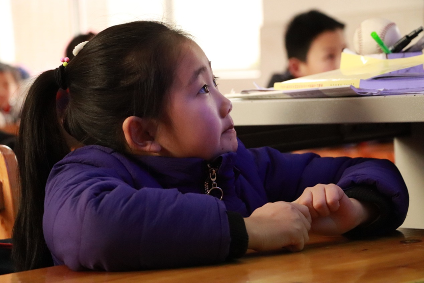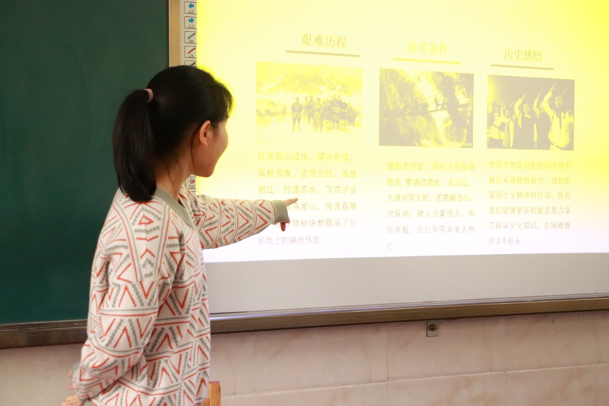 为了调动课堂气氛,激发同学们的兴趣,宣讲以一系列与“红色”相关的选择题开始。同学们都十分踊跃,通过回答也能够看出他们对“红色精神”有一定的了解。随后志愿者围绕“回顾漫漫长征路”、“抗日艰辛道路”、“如何争做优秀少先队员”、“现今中国的发展”四方面展开宣讲,宣讲期间志愿者结合自身拜访老兵、祭扫烈士墓和参观博物馆的经历,呼吁同学们关爱老兵缅怀抗日英雄、主动了解当地红色文化。在此期间,同学们都端坐在自己的座位上,神情专注地听着志愿者的讲解,一步一步的被志愿者带着进入更深的红色精神世界。