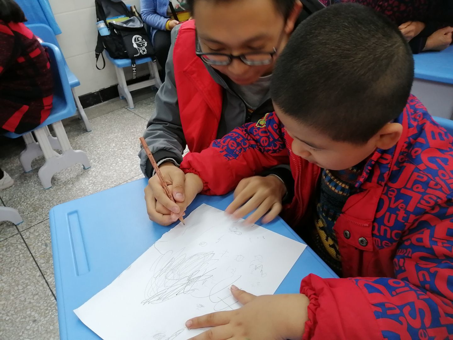授课后便是绘画环节,志愿者们下发纸和笔,带领孩子们画画,画出自己所思念的人画出他们所感恩的人。孩子们对画画很感兴趣,与家长和志愿者们一起完成一副又一副图画。志愿者们握着孩子们的手在纸上画出他们的心之所想,画中的口罩上有小花、小狗、小猫。三名孩子拿着自己的画在志愿者的带领下上讲台向大家讲述画的内容,收获了其他孩子们的鼓掌。