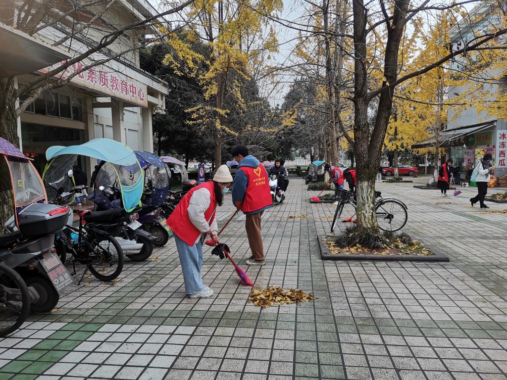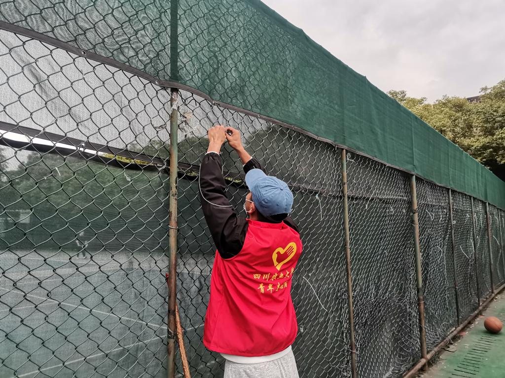下午三点,志愿者们在食堂集合后,进行了明确的分工后,两人摆放桌椅,两人清洁桌面,剩下的同学则去帮助阿姨扫地。无论是将桌椅摆放整齐,还是清理桌面的食物残渣,亦或是扫地,志愿者们都抱着为食堂阿姨减少工作量的心态。在完成食堂志愿活动之后,志愿者们意犹未尽,一位志愿者说:“我们还可以继续做志愿活动吗?我们也可以去帮保洁阿姨清扫一下街道,而且篮球场也可以去清扫一下。”于是,志愿者们分为两批,分工合作,一组清扫食堂周围的落叶和垃圾,另一组清理篮球场铁网上的胶带。清理完后的街道变得整洁干净,篮球场也显得更有生机活力。