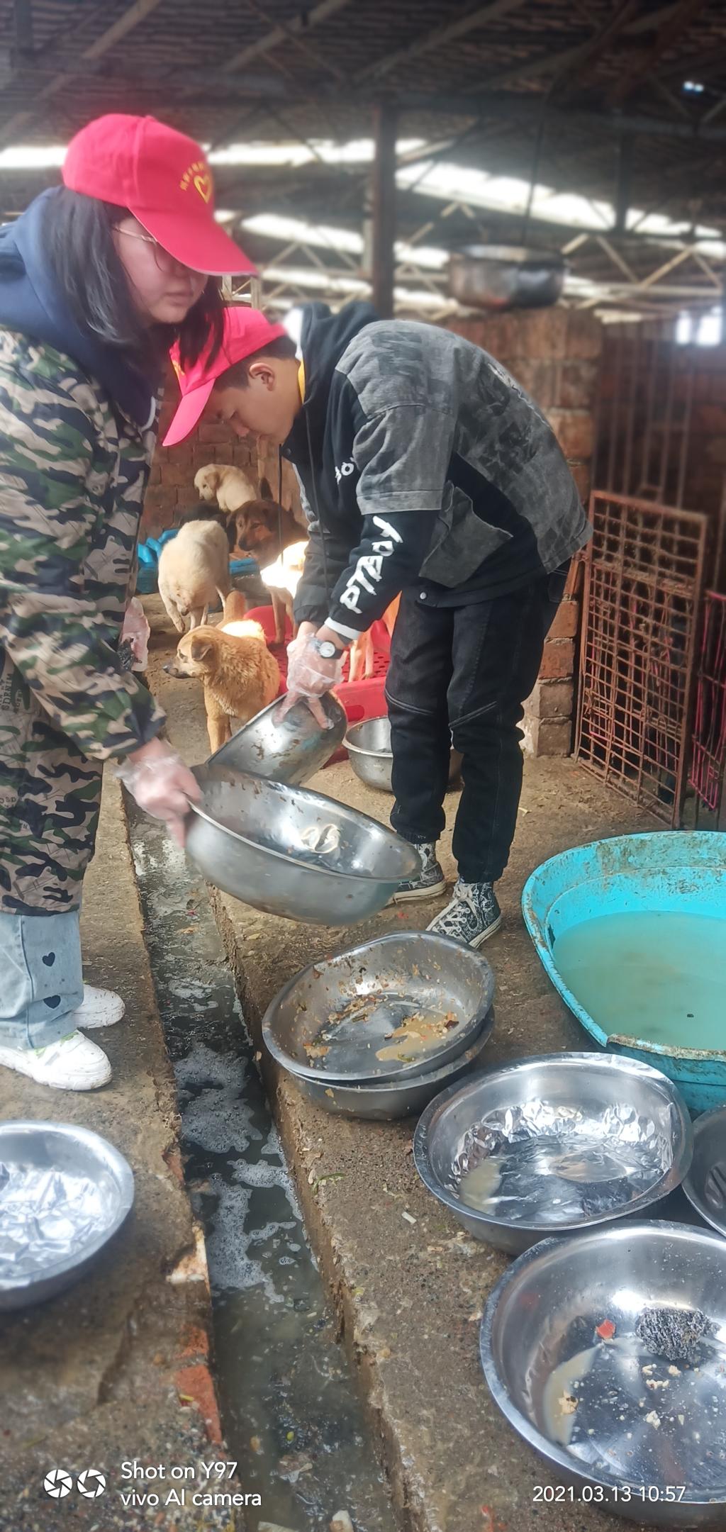 由于路程遥远,志愿者们提前从学校出发前往救助中心。接近11点的时候才到达救助中心,志愿者们在工作人员的带领下与流浪狗近距离接触,并帮助工作人员清洗了大量用于喂狗的盆子。在一片犬吠声中,志愿者们不介意环境的恶劣,完成了工作人员交代的工作。工作之余,通过与救助中心工作人员交谈中得知,救助中心工作人员少、流浪狗数量庞大,工作量之大超乎想象,仅是喂狗就需要花将近三个小时。
