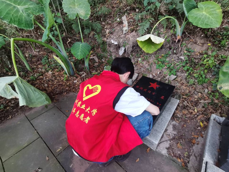 拭灰尘扫落叶,祭烈士英魂。烈士陵园环境清幽,从阶梯慢慢往上走,随处可见笔直青翠的松树、波光粼粼的人工湖、清雅安静的亭台,每一处都安静得落针可闻,志愿者们在这样的环境和氛围中慢慢踏入烈士陵园,感受着这些安静下蕴藏的属于烈士们生生不息的精神。每一次毛巾擦过墓碑,每一次扫帚划过青石板,都会发出细小又让人安心的声音,志愿者们都认真做着自己安排范围的分配工作。烈士墓碑上刻着每一位烈士的名字,上面会刻上这位烈士的家乡和牺牲原因。或有烈士魂归故里,或有烈士远离家乡,或有烈士没有姓名只有干干净净的墓碑,这些英雄,用自己的生命为国家闯出了一个独一无二的未来,是国家发展至今的前提,如今这些英雄们用另一种默默无声的方式活在每一个人的心里,活在国家的血液里,经久不息。