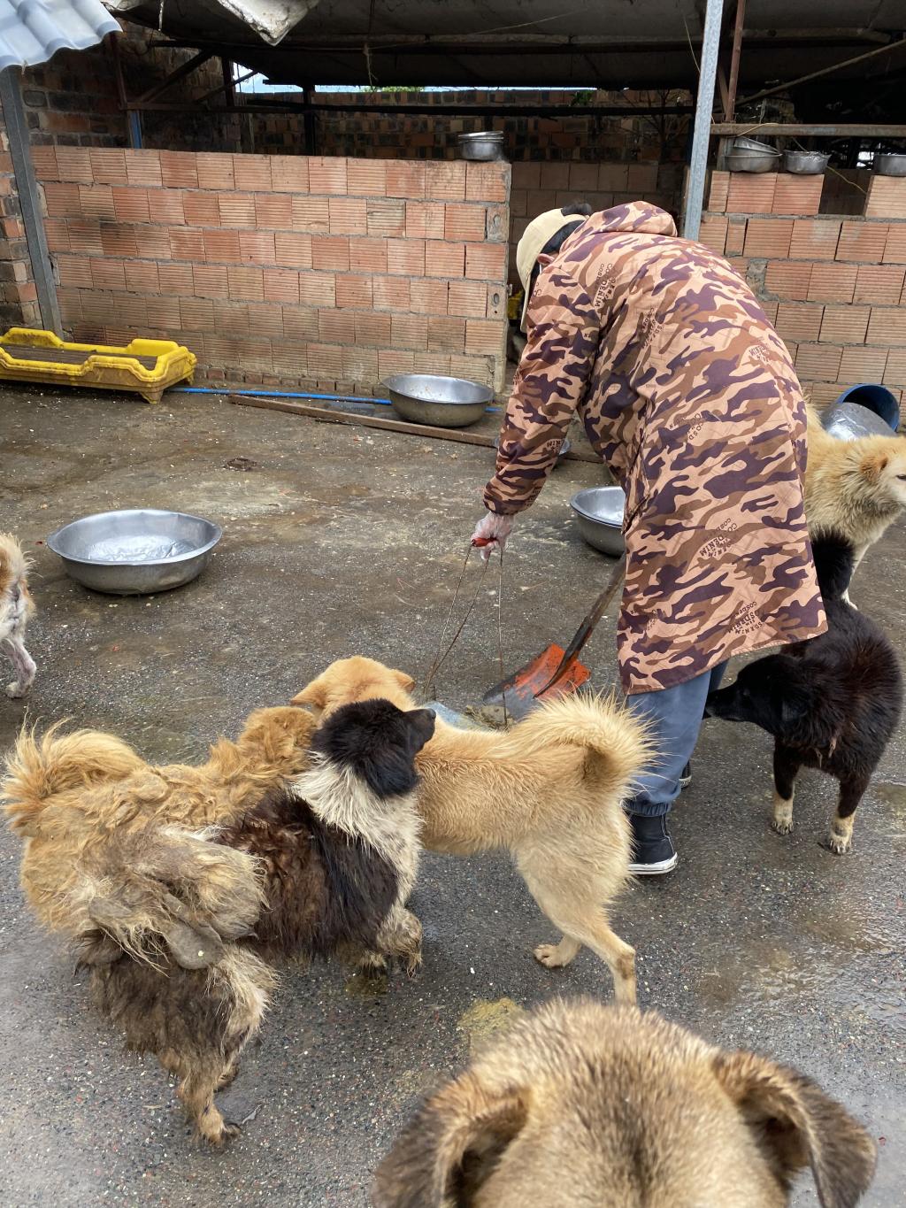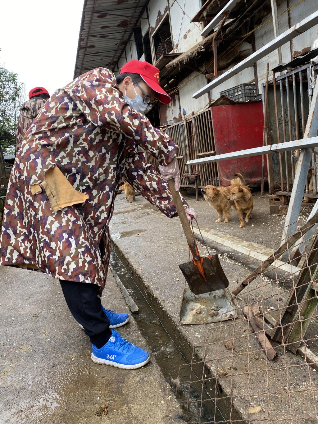 志愿者们在护工人员的指导下,积极地投入到打扫地面、清洗饭碗等工作。即使现场的环境恶劣,气味难闻,但志愿者们从未停下过。经过志愿者的一番努力后,狗狗生活的环境焕然一新,狗狗们看到自己焕然一新的饭碗后,也忍不住舔了舔。两小时志愿活动很快就结束了,志愿者与护工人员、流浪狗还是依依不舍。