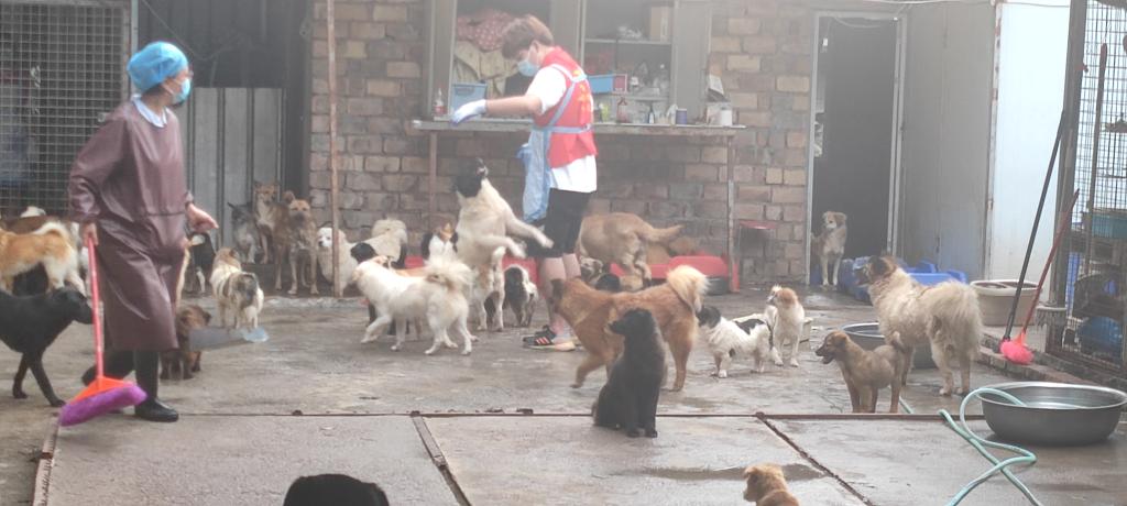 在基地工作人员的指导协助下,志愿者们分为三组,并迅速投入到工作中。第一组志愿者负责清扫地面,在工作人员的协助下,志愿者们任劳任怨、认真做好了地面清洁,让流浪狗之家焕然一新。第二组志愿者负责为流浪狗准备食物,这些食物是工作人员从各处餐厅收集来的临近过期的一些肉类以及鸡蛋,对于流浪狗来说是难得的美味。第三组志愿者负责在流浪狗基地附近为一只过世的流浪狗修建坟墓,由于工具有限,志愿者采用轮换的方法进行刨坑,以节省体力,从而高效快速地完成任务。