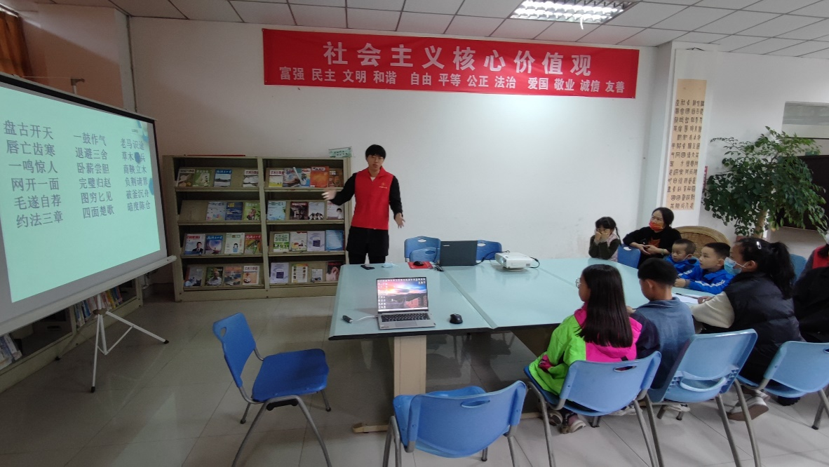 下午14:00时,志愿者们集合前往雅安市图书馆,抵达图书馆后,进行准备工作的进行,“爱阅读会生活”主题活动于14:30准时开始。由于疫情开放的原因,参与此次活动的小朋友比以往较多。活动开始,志愿者先为小朋友们从国家、社会和个人层面解释了社会主义核心价值观,小朋友们聚精会神地听着讲解,并进行了现场背诵;随后,志愿者开始为小朋友们开展有关历史的分享会,分享会的内容和形式多种多样,有中华民族上下五千年各朝代的简介以及各朝代的优秀故事和英雄人物讲解,并有有趣的小游戏穿插其中,如根据成语猜人物,根据成语讲故事等,并邀请小朋友上台分享自己所知道的历史故事和观看历史动画。最后,志愿者跟随图书馆老师的脚步,将小朋友们带去了红色展览馆,参观了历史红色遗址的相片,同时也给小朋友们讲了革命家李大钊和优秀党员雷锋的故事。至此,此次活动结束,小朋友们带着今天学习的知识跟随家长开心地回家,志愿者们也对会场进行了仔细地整理和清洁。