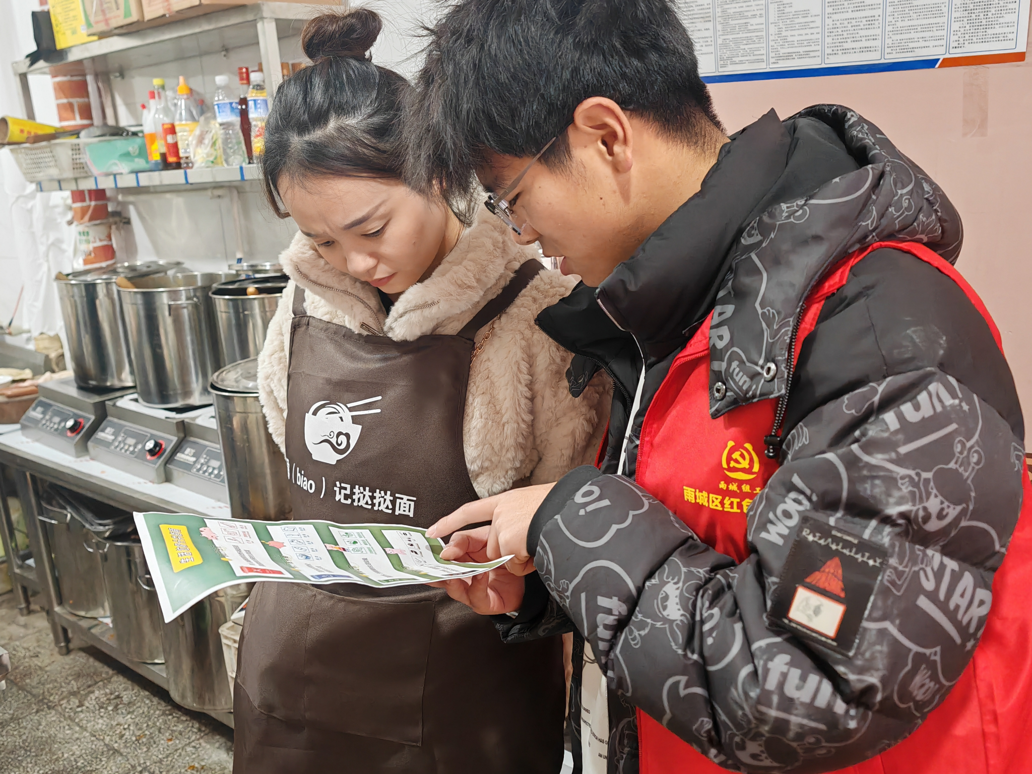 净山河小组成员正在给小区居民和商户进行垃圾分类知识的宣传,提高居民和商户的垃圾分类意识