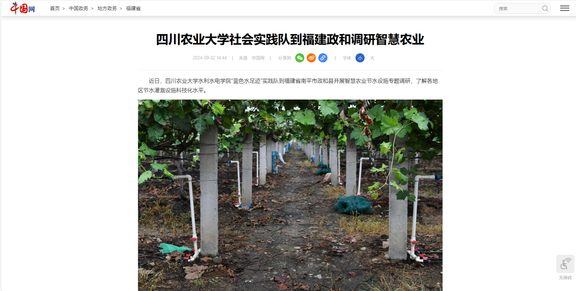 近日,学院“蓝色水足迹”实践队到福建省南平市政和县开展智慧农业节水设施专题调研,了解各地区节水灌溉设施科技化水平。