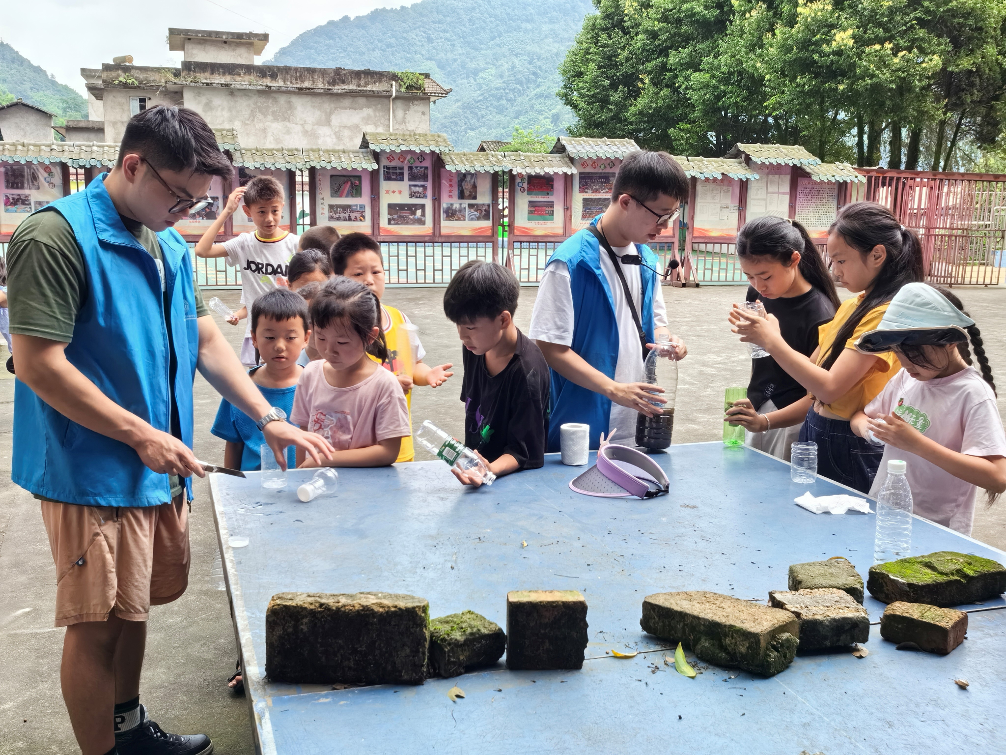 (图为实践志愿团队成员分发简易净水装置制作材料。王子明 摄)