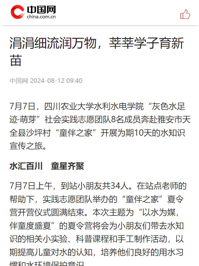 7月7日,学院“灰色水足迹·萌芽”社会实践志愿团队8名成员奔赴雅安市天全县沙坪村“童伴之家”开展为期10天的水知识宣传之旅。