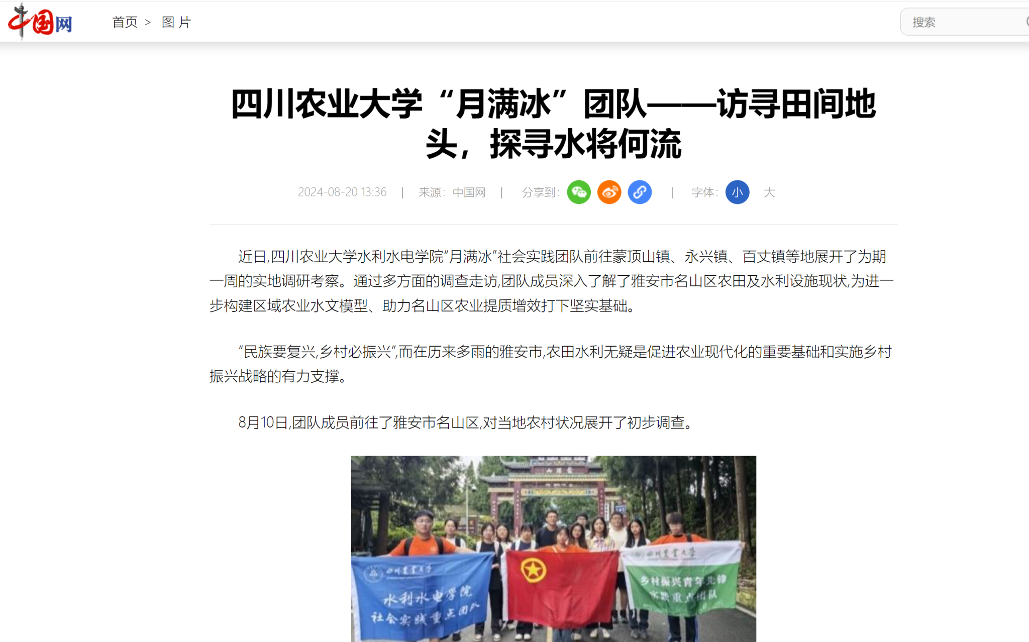 近日,学院“月满冰”社会实践团队前往蒙顶山镇、永兴镇、百丈镇等地展开了为期一周的实地调研考察。通过多方面的调查走访,团队成员深入了解了雅安市名山区农田及水利设施现状,为进一步构建区域农业水文模型、助力名山区农业提质增效打下坚实基础。