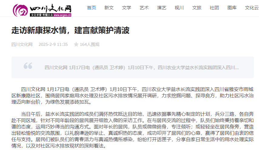 1月10日下午,四川农业大学益水长流实践团深入四川省雅安市雨城区新康路社区,围绕居民家庭用水处理及社区污水排放情况展开调研,力求挖掘问题、探寻良方,助力社区污水治理迈向新台阶,为绿色发展添砖加瓦。