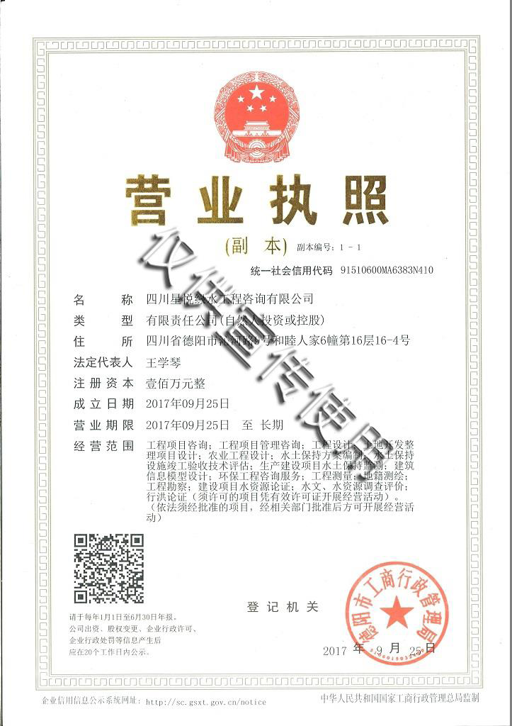 四川星悦绿水工程咨询有限公司是一家专业从事农林工程和水利工程勘测设计咨询的民营企业,成立于2017年9月,注册资金100万元,办公面积约300m2。公司位于“长江文明之源,中国重装之都”的四川省德阳市,距省会成都约37km,距绵阳市市区45km。公司主要从事工程勘察、水利工程设计(证号:A251028347,范围包括水库枢纽、引调水、灌溉排涝、河道整治、城市防洪、围垦、水土保持、水文设施等)、农林工程设计(证号:A251028347,范围包括土地治理工程、高科技农业园艺工程、农业废弃物处理工程、农业生态工程、可再生能源工程,农业综合开发项目、高标准农田建设项目、千亿斤粮食项目等)、工程测量、水土保持方案编制、水资源论证报告编制、行洪论证与河势稳定评价报告编制、入河排污口设置论证和城乡规划编制等业务。公司现有职工总数13人,其中高级工程师4人,工程师4人,助理工程师3人,管理人员2人。