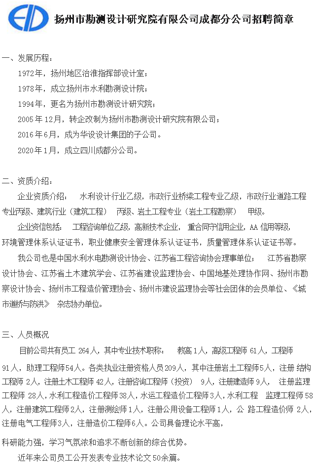 扬州市勘测设计研究院有限公司成都分公司成立于 2020 年 1 月,现有员工近 30 人, 其中各专业技术人员 20 余人,水工、测量、水文、水保、概算、地质等专业人员齐全。公 司办公地位于成都市青羊区中坝地铁口,交通便利,配套设施齐全。